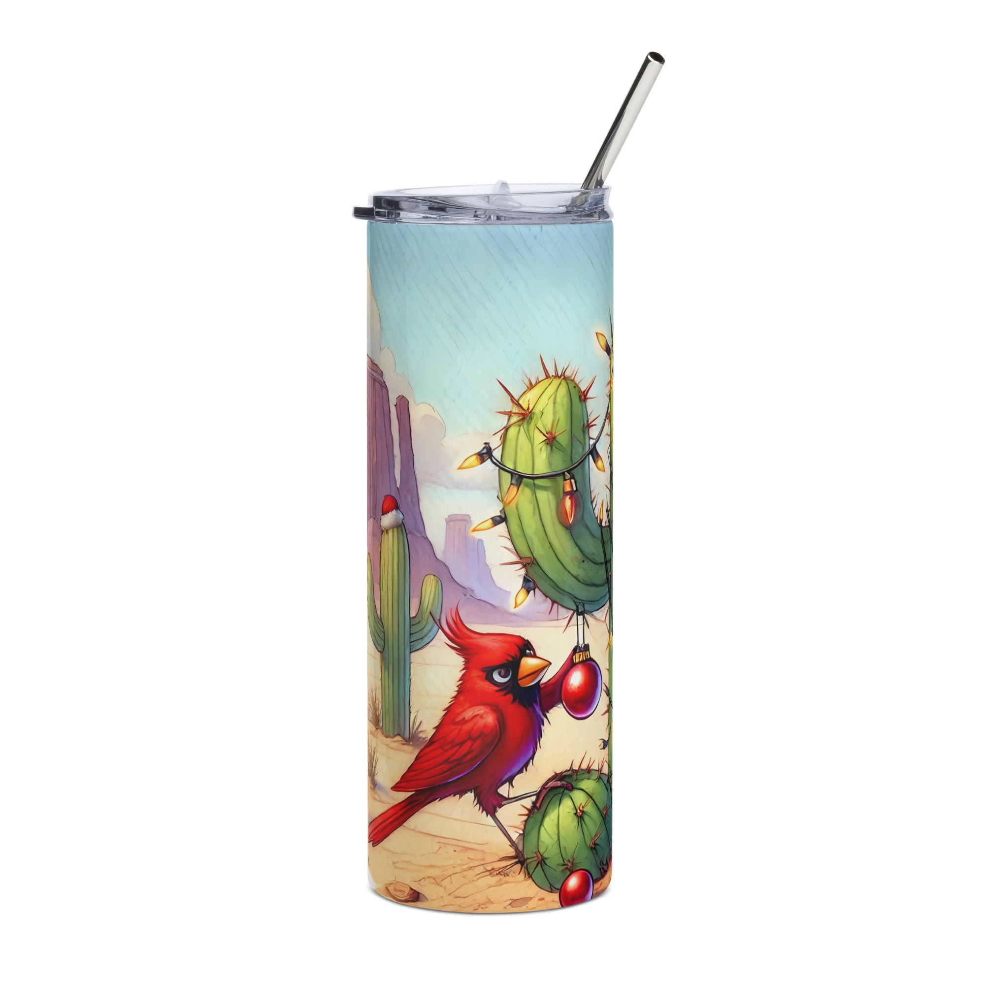 Celebrate Christmas with a warm desert twist. This vibrant stainless steel tumbler features a tall cactus decorated with glowing lights, festive ornaments, and cheerful red cardinals wearing tiny Santa hats. A perfect blend of holiday spirit and Southwestern charm.