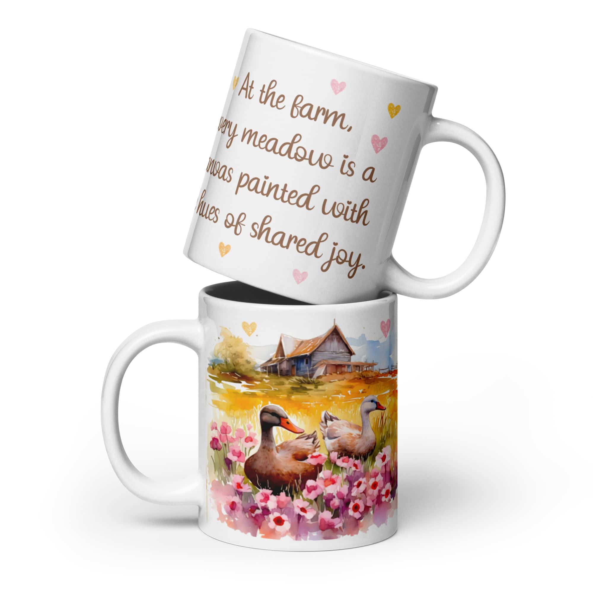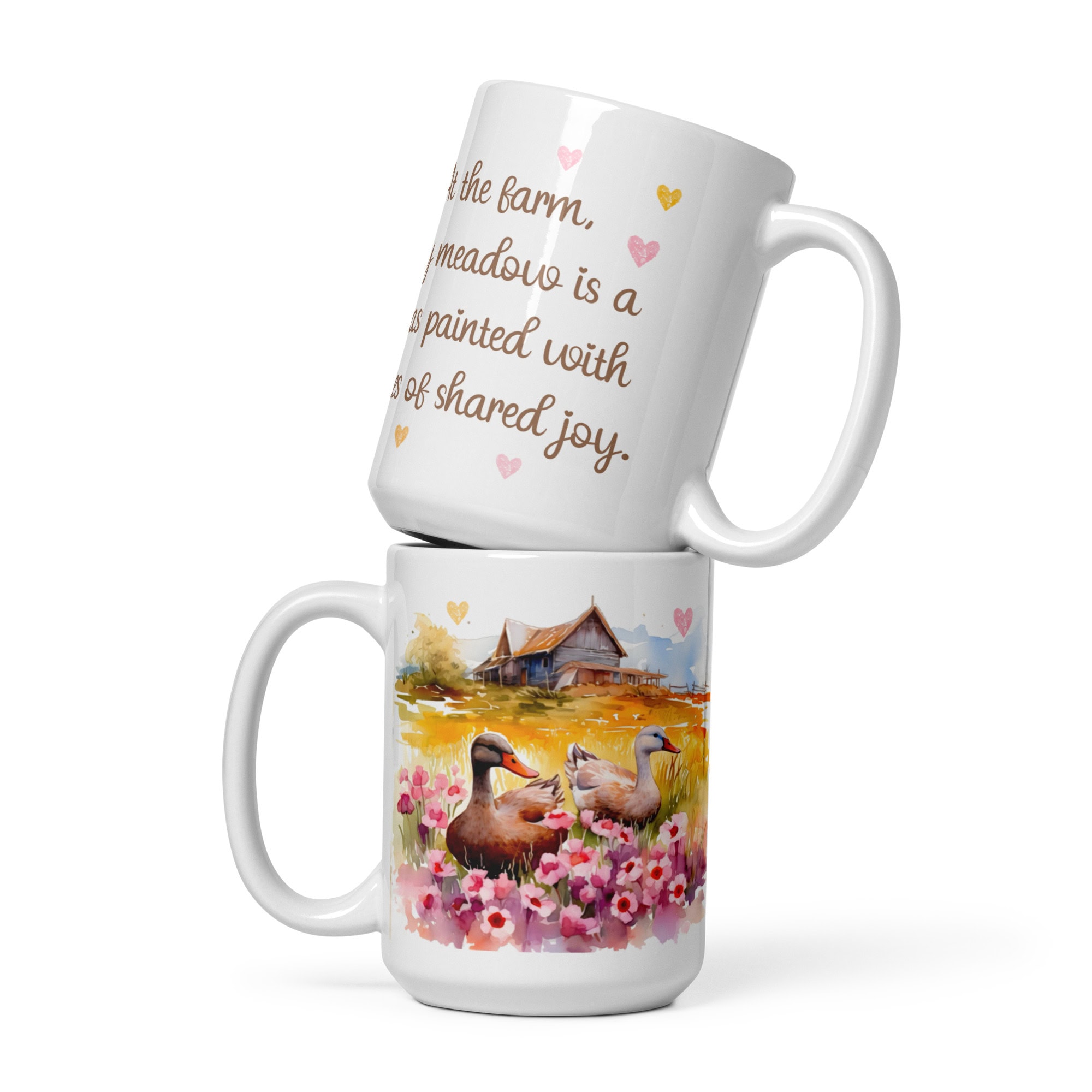 Step into a world of warmth and tranquility with this lovely farm-inspired mug. Featuring watercolor ducks surrounded by vibrant meadow flowers, itâs paired with an uplifting quote that celebrates lifeâs shared happiness.