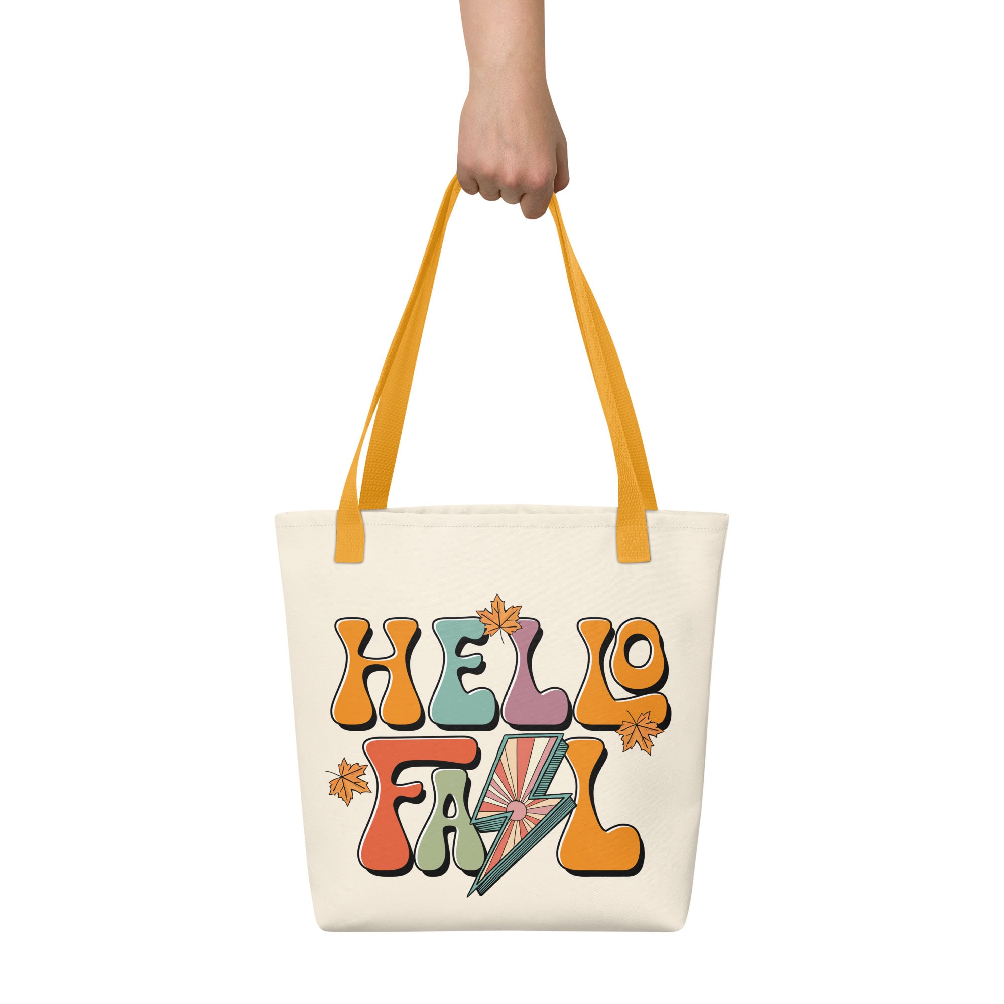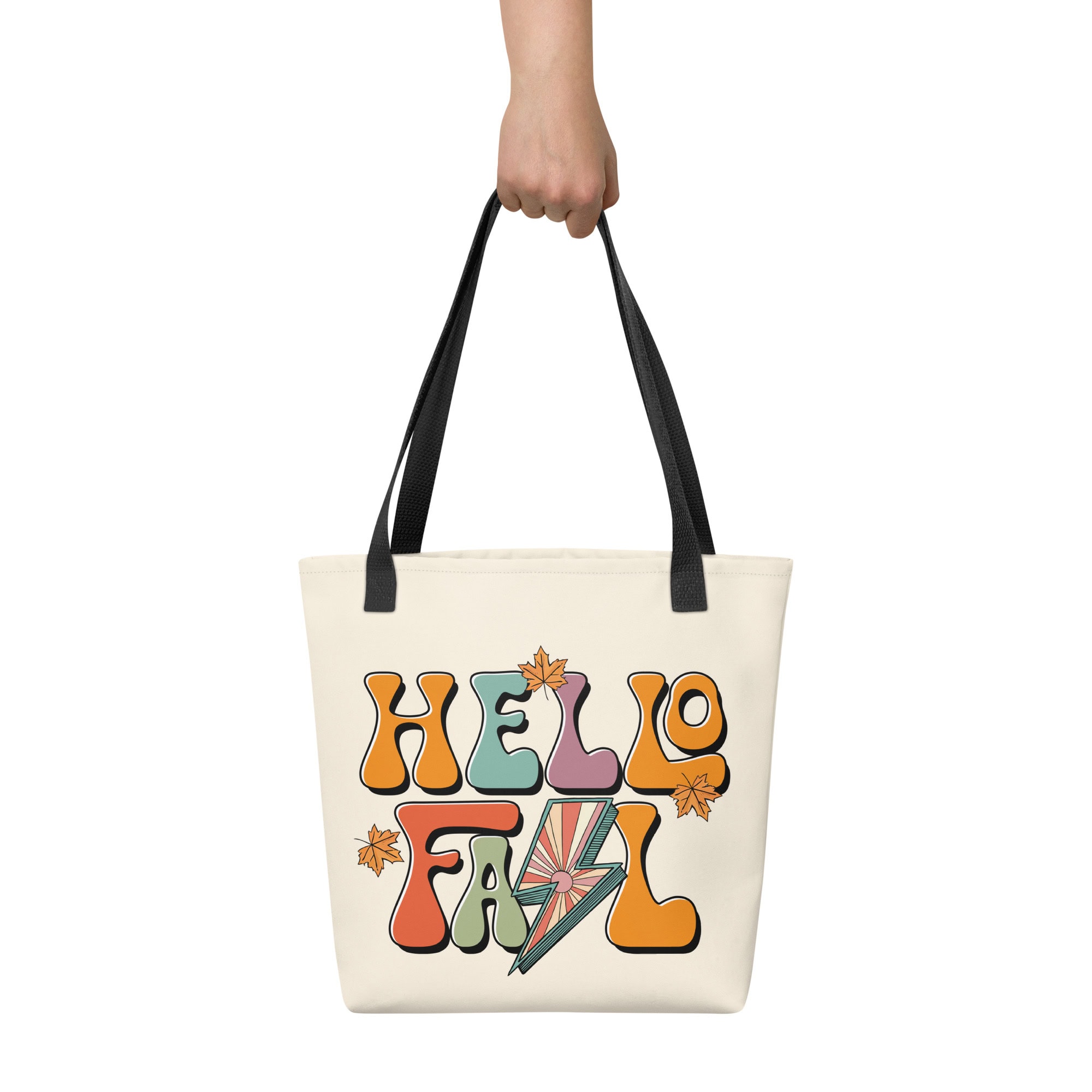 Add a touch of vintage charm to your everyday style with the Hello Fall All-Over Print Tote Bag đģ