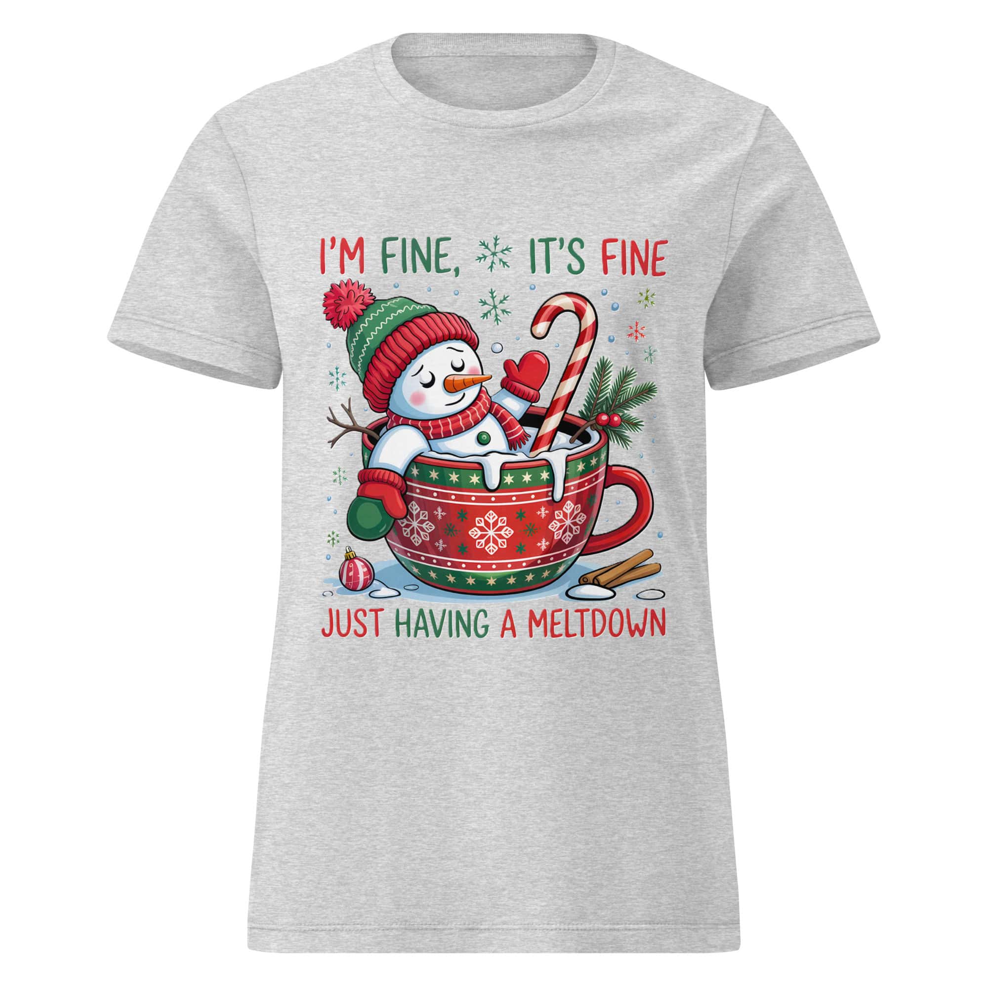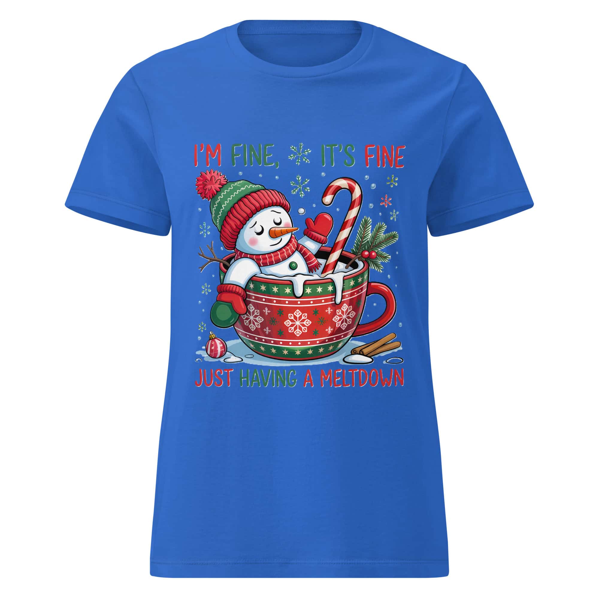 Make everyone smile this winter with our I’m Fine, It’s Fine, Just Having a Meltdown women’s t-shirt — featuring a charming snowman soaking in hot cocoa.