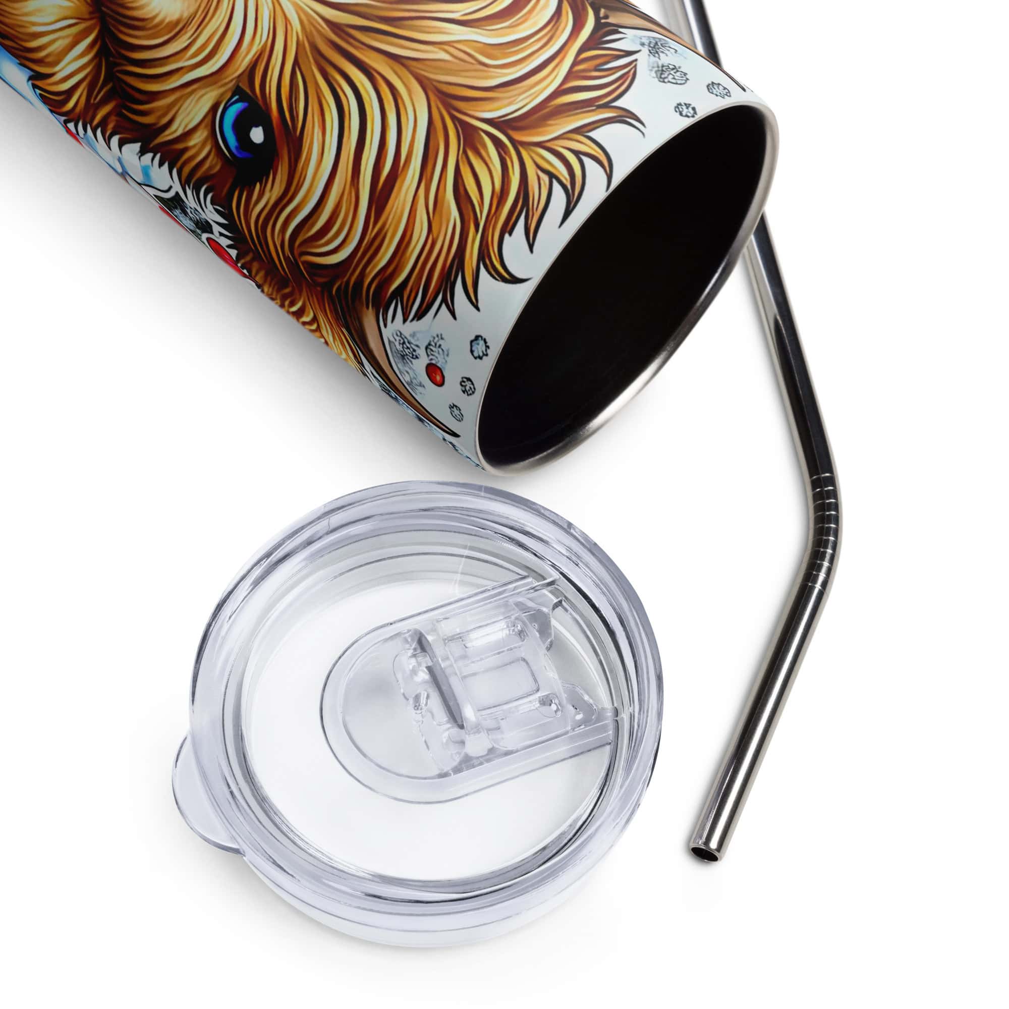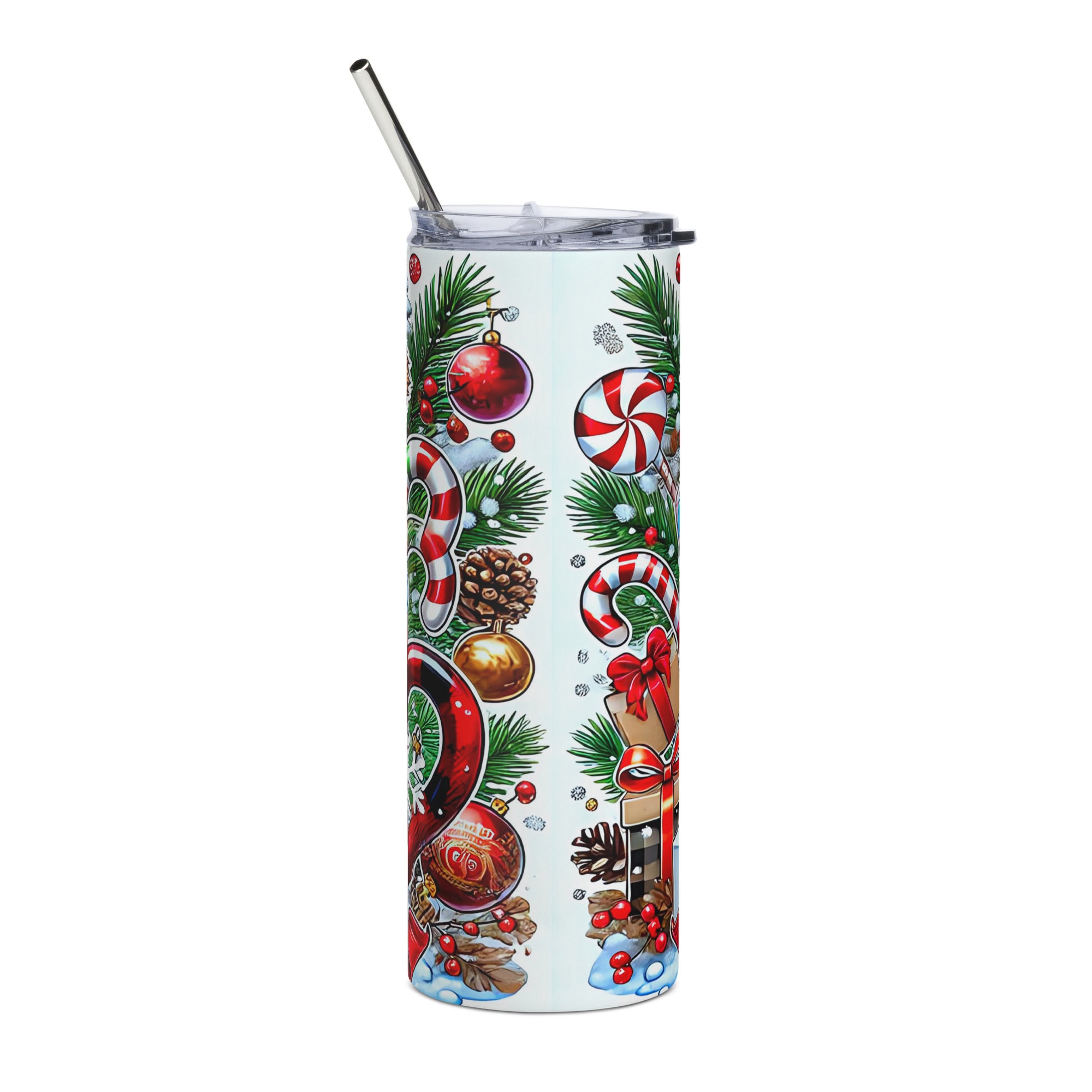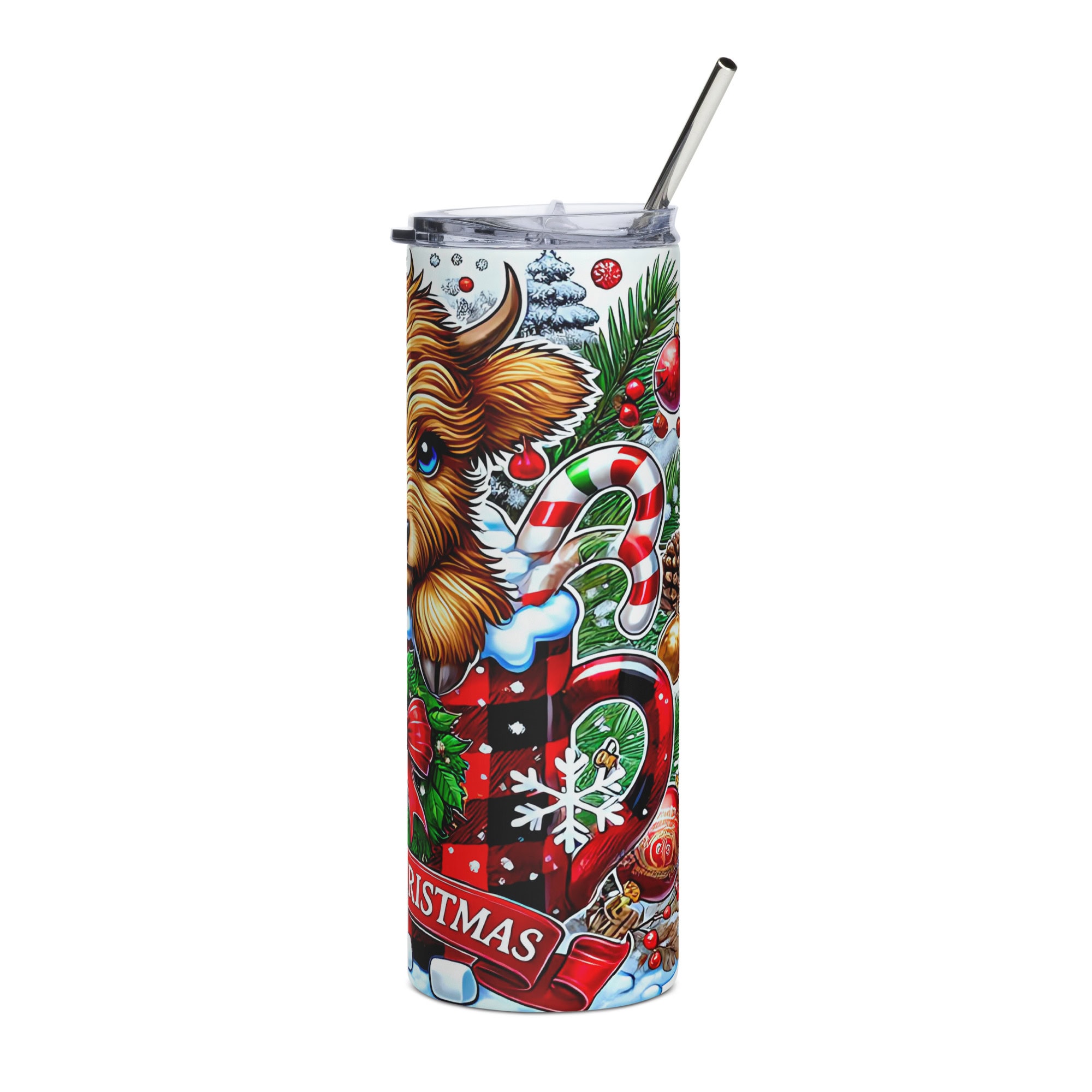 This festive stainless steel tumbler features an adorable Highland cow peeking from a buffalo-plaid mug surrounded by candy canes, gifts, and pine branches. A cozy holiday drinkware essential.
