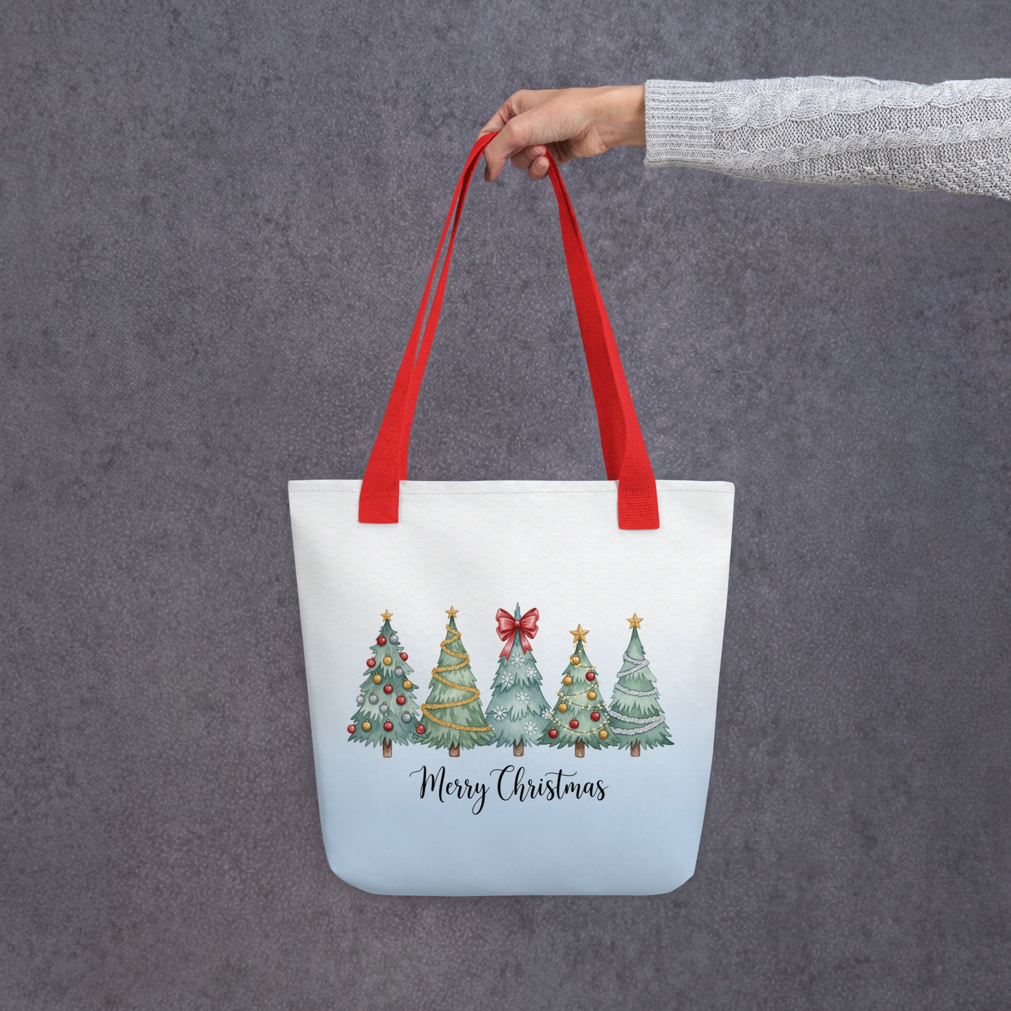 Carry festive joy wherever you go with this charming Merry Christmas Trees tote bag — durable, spacious, and perfect for your holiday errands or gifting season.