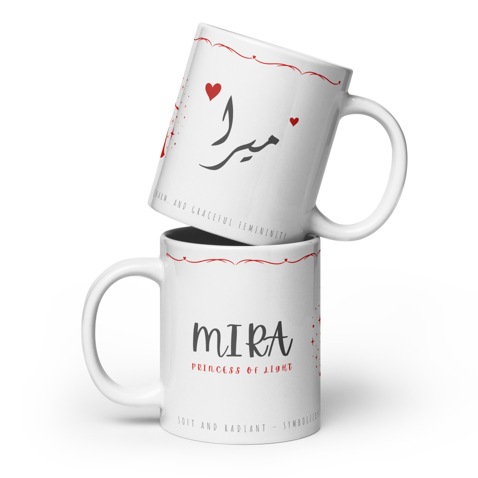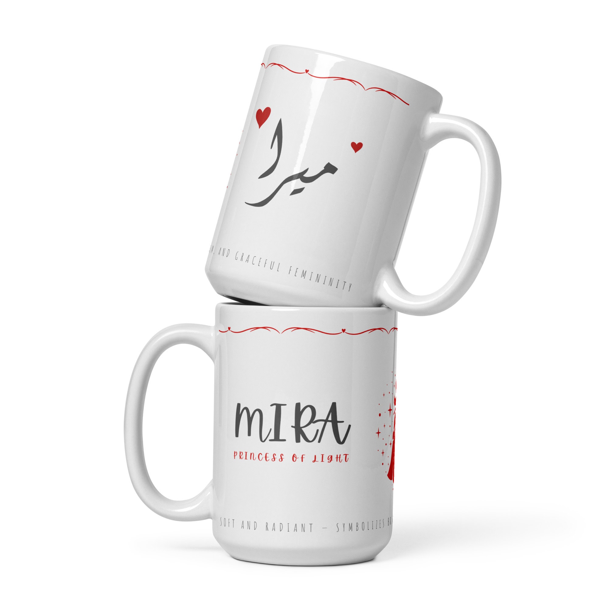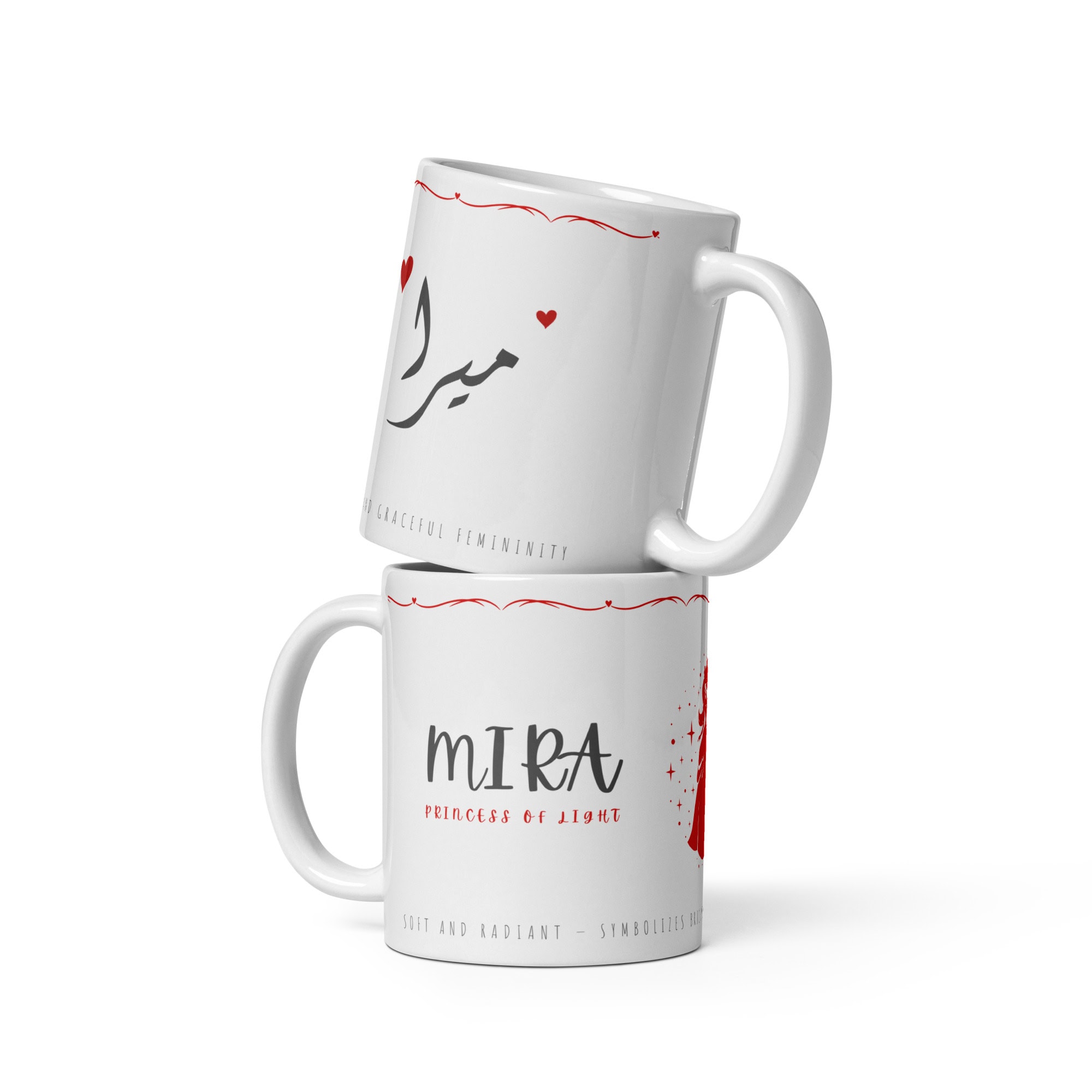 A radiant Arabic–English name mug featuring Mira (Ų…ŲŠØąØ§) with a glowing princess illustration and a poetic meaning line wrapped around the base. Soft, charming, and beautifully magical.