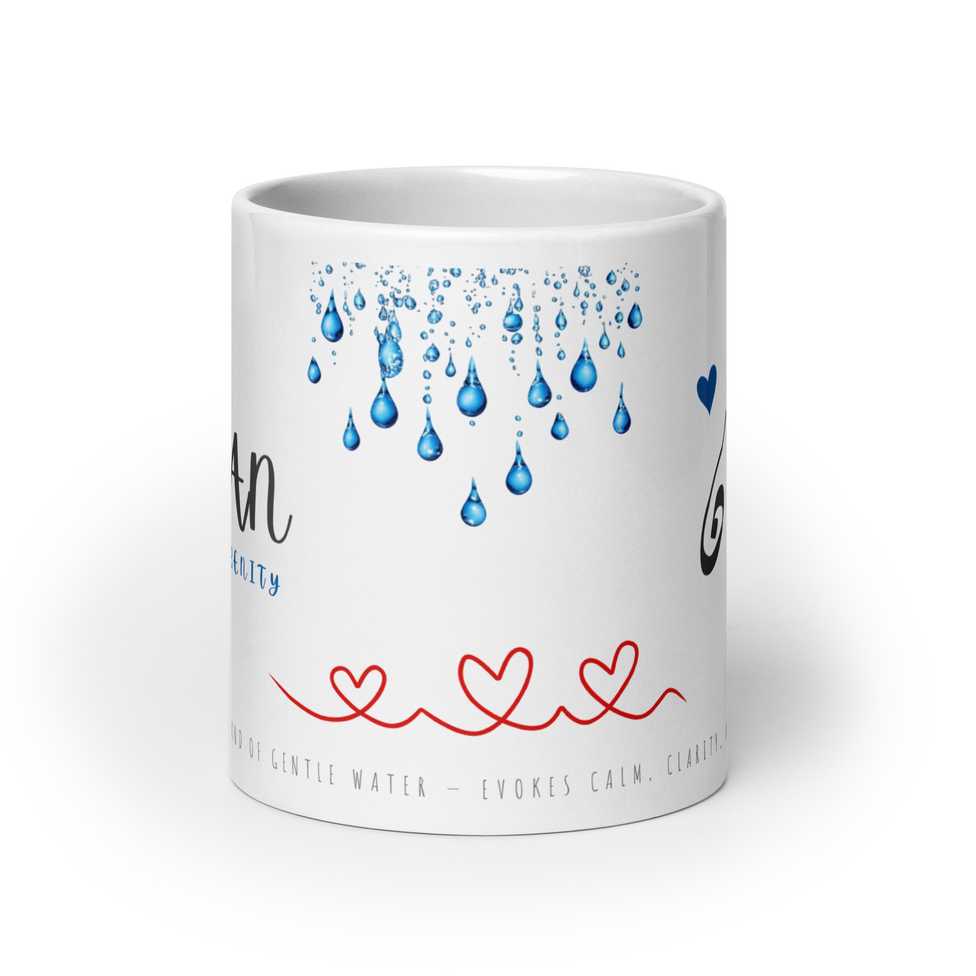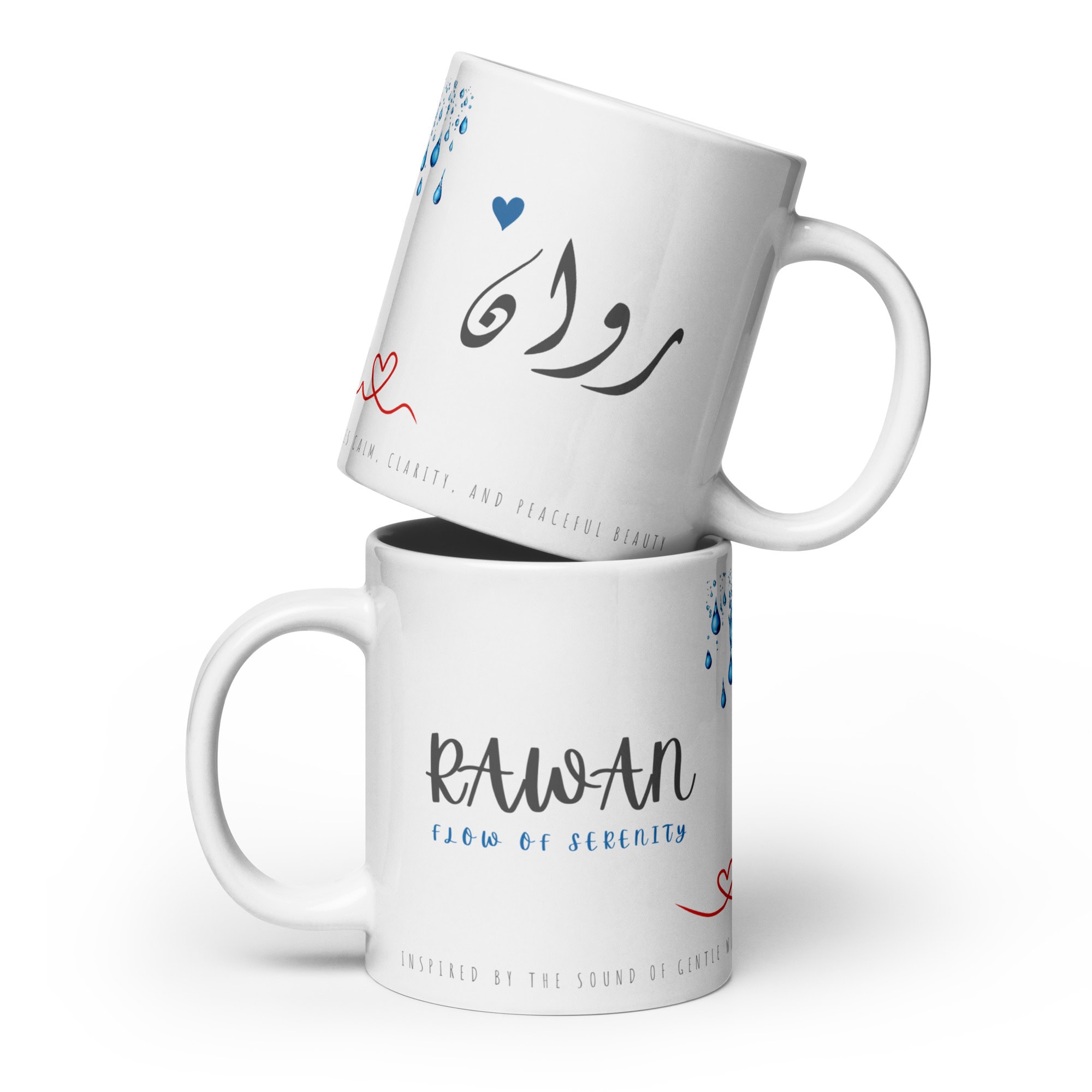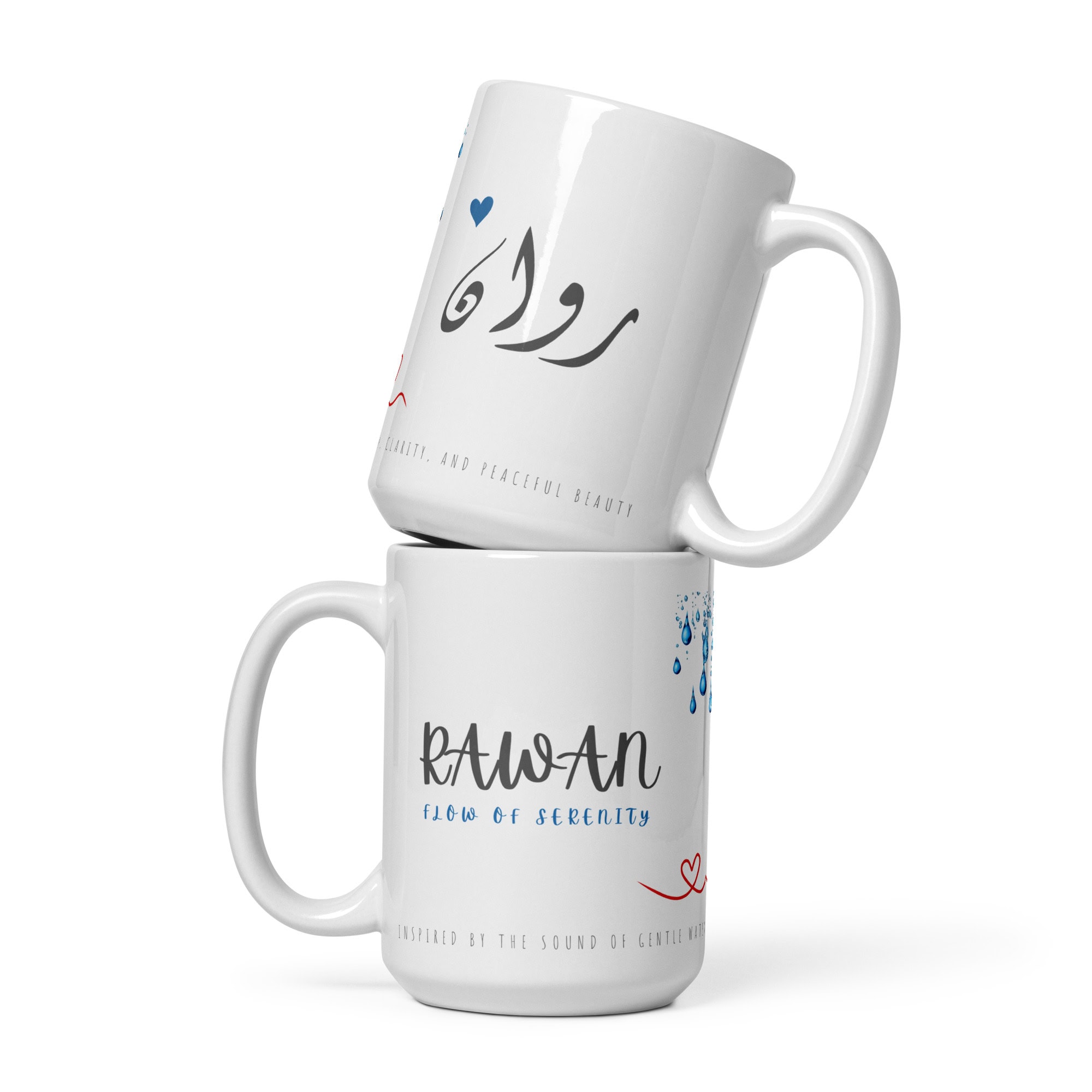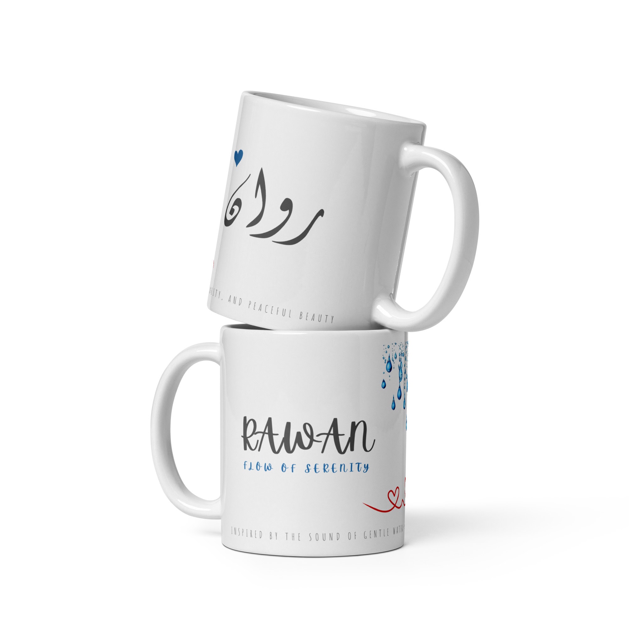 This calming and beautifully artistic mug blends Arabic calligraphy with a soft English name design, expressing the peaceful and fluid meaning behind the name Rawan. The cascading blue water-drop artwork brings a fresh, serene feeling, while the poetic wrap-around meaning line adds depth and emotional elegance.