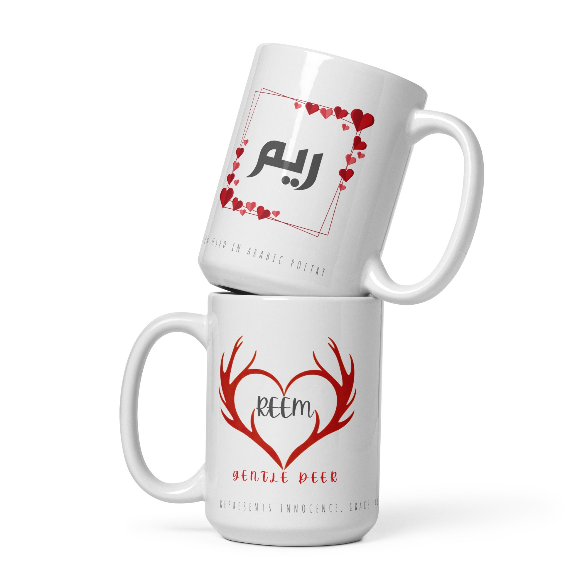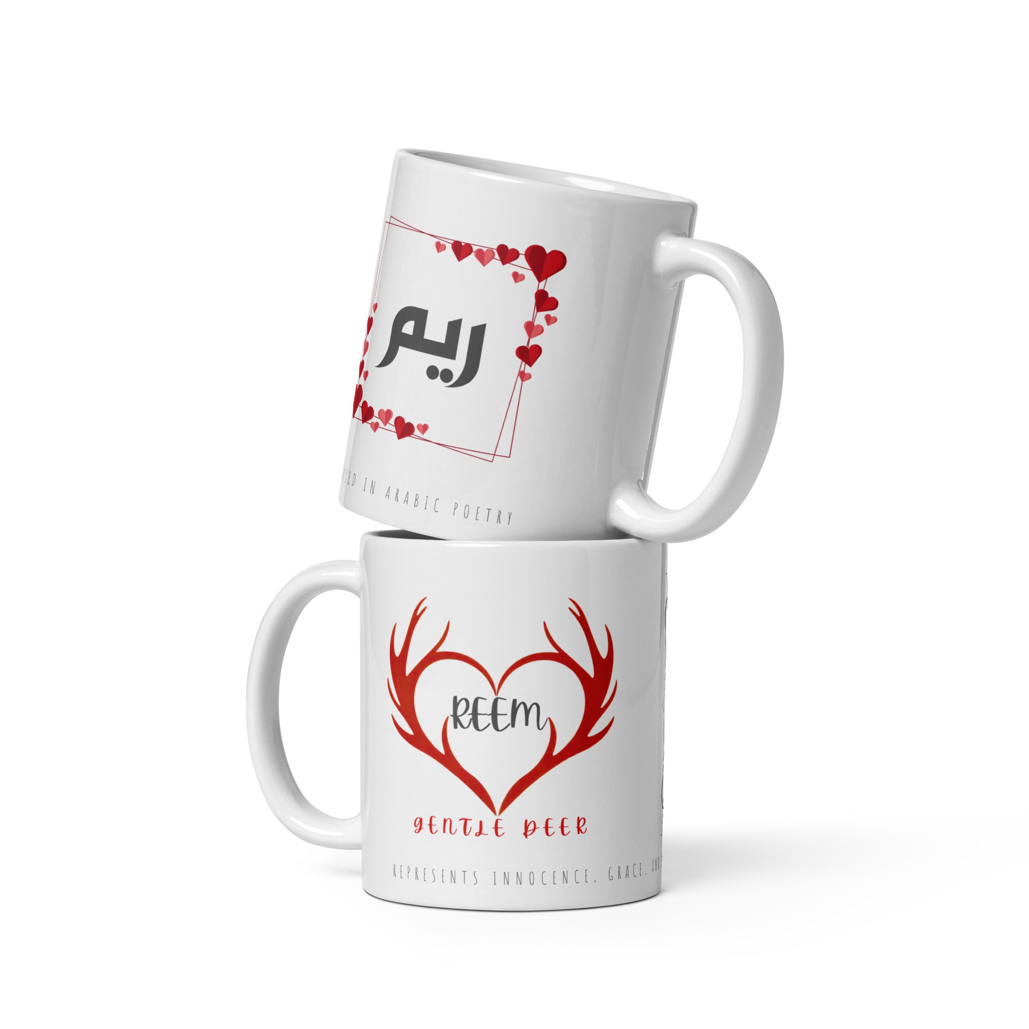 This poetic and symbolic mug blends elegant Arabic calligraphy with a soft English name design, beautifully capturing the meaning of the name Reem â a gentle, graceful deer often celebrated in Arabic poetry. The antler-heart illustration adds emotional depth, while the wrap-around meaning line highlights innocence, purity, and natural beauty.