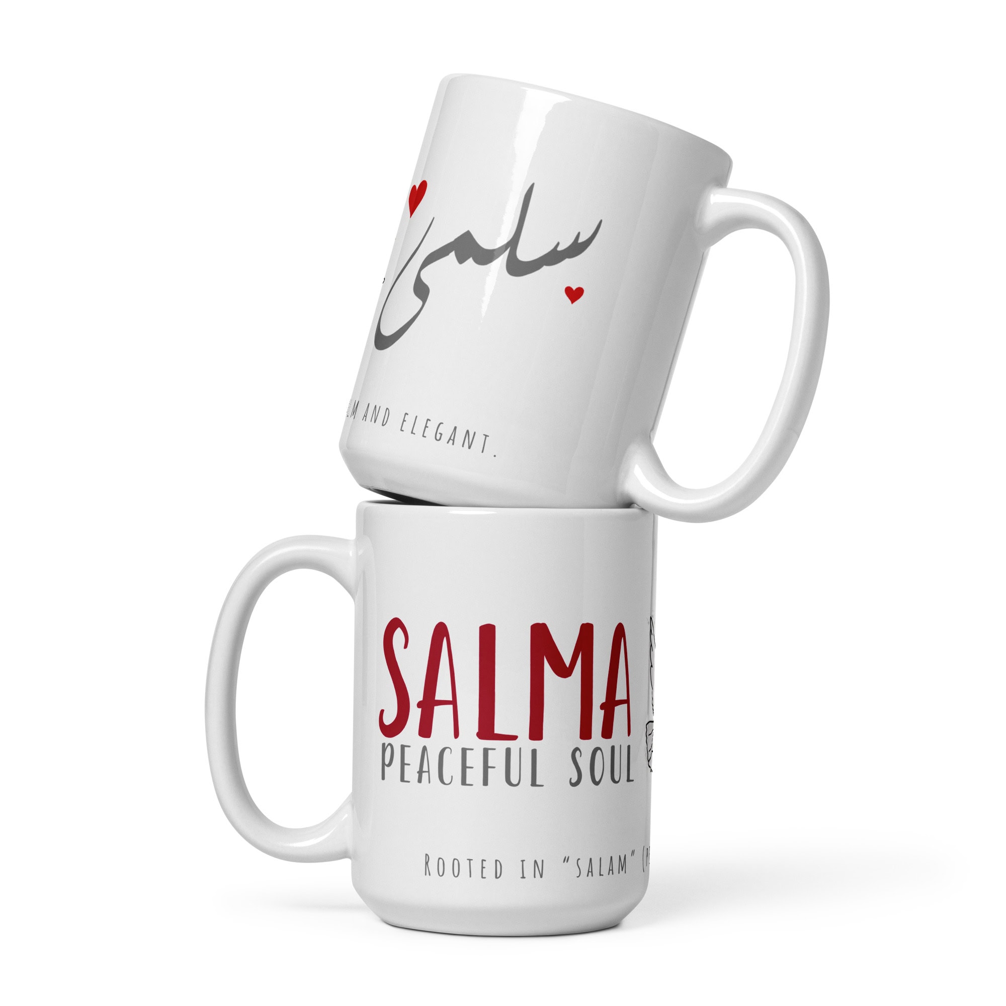 Find serenity in every sip with this beautifully designed *Salma* mug. The Arabic calligraphy “سلمى” is delicately paired with the English translation “Peaceful Soul,” creating a meaningful and artistic tribute to calm elegance.