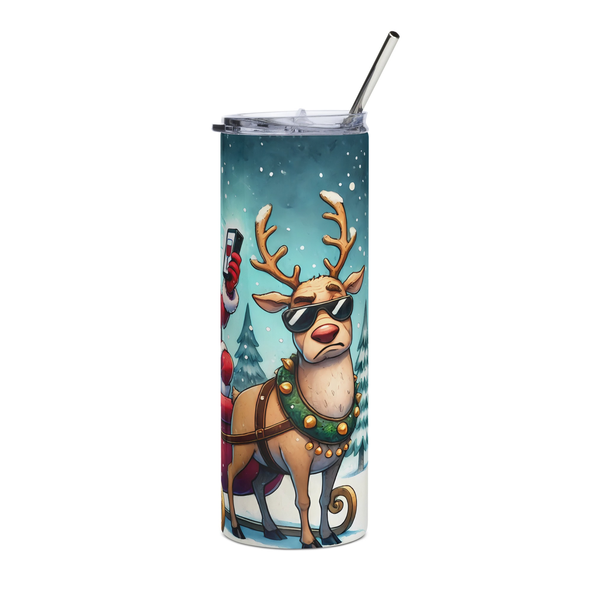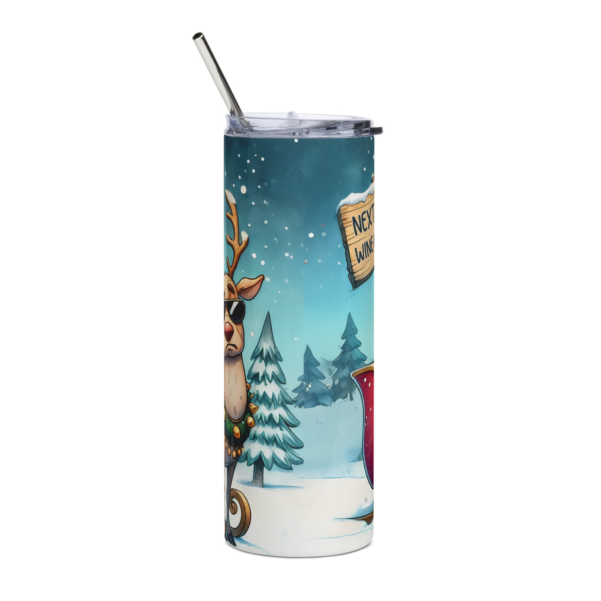 A hilarious stainless steel tumbler featuring Santa scrolling for wine, a sassy reindeer in sunglasses, and the sign: “Next Stop: Wine & Whine.” Perfect for festive humor lovers.