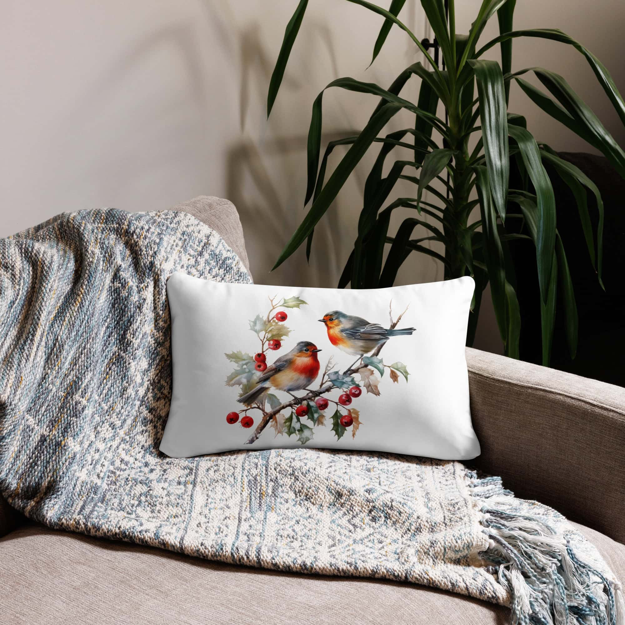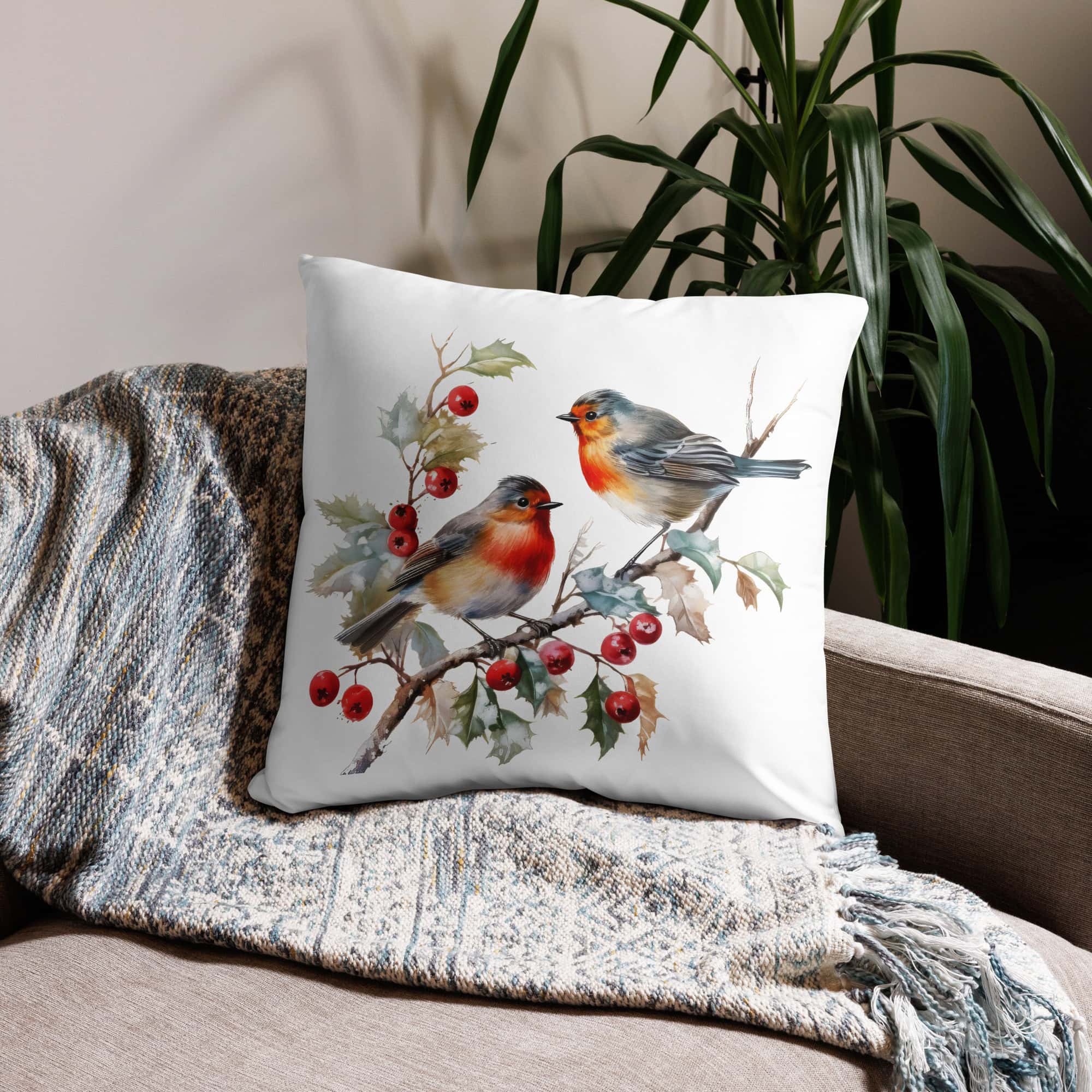 Bring the warmth of winter nature indoors with this Winter Birds Decorative Pillow, showcasing two charming red robins resting on a holly branch surrounded by red berries. The crisp, detailed print adds a cozy seasonal touch to any sofa, bed, or reading corner.