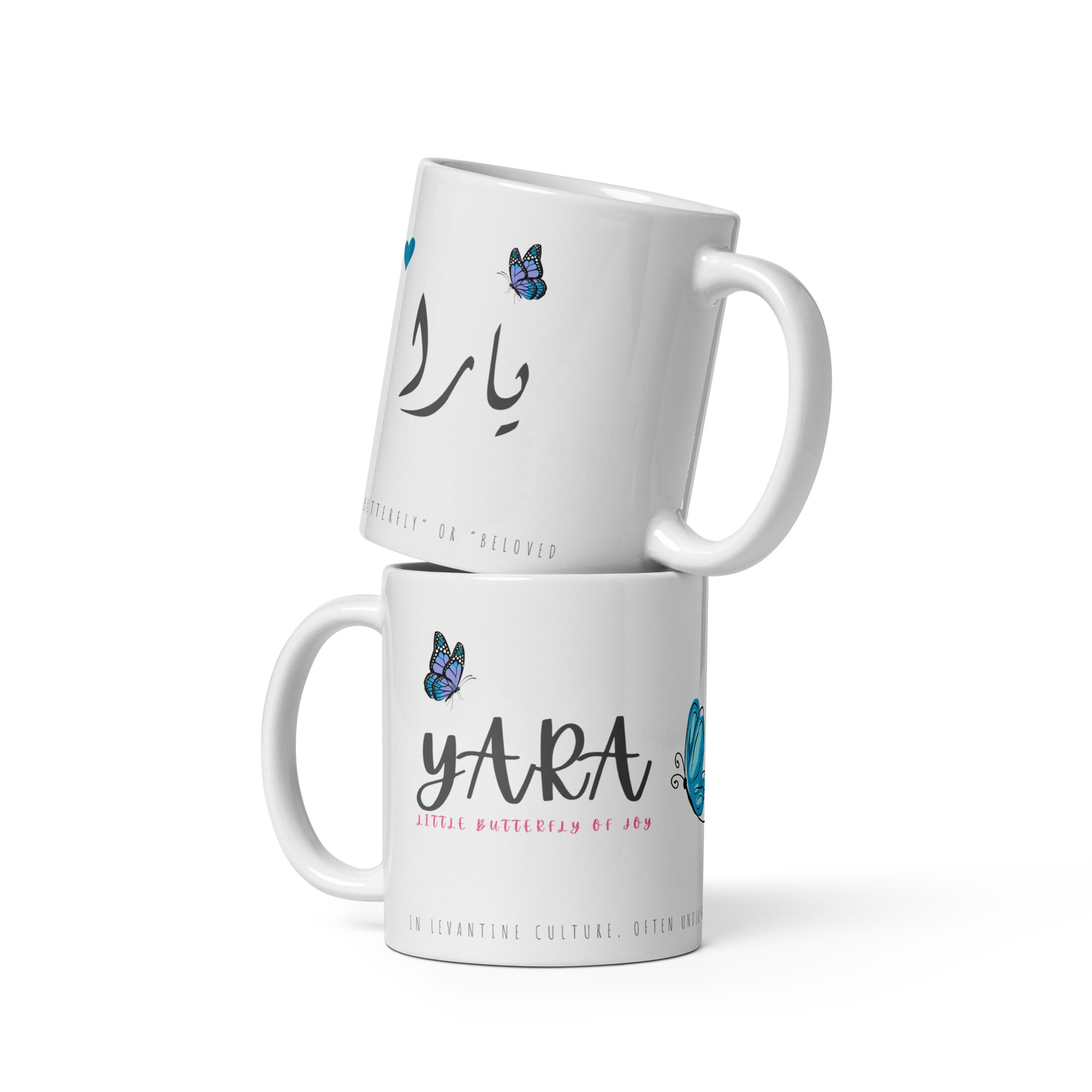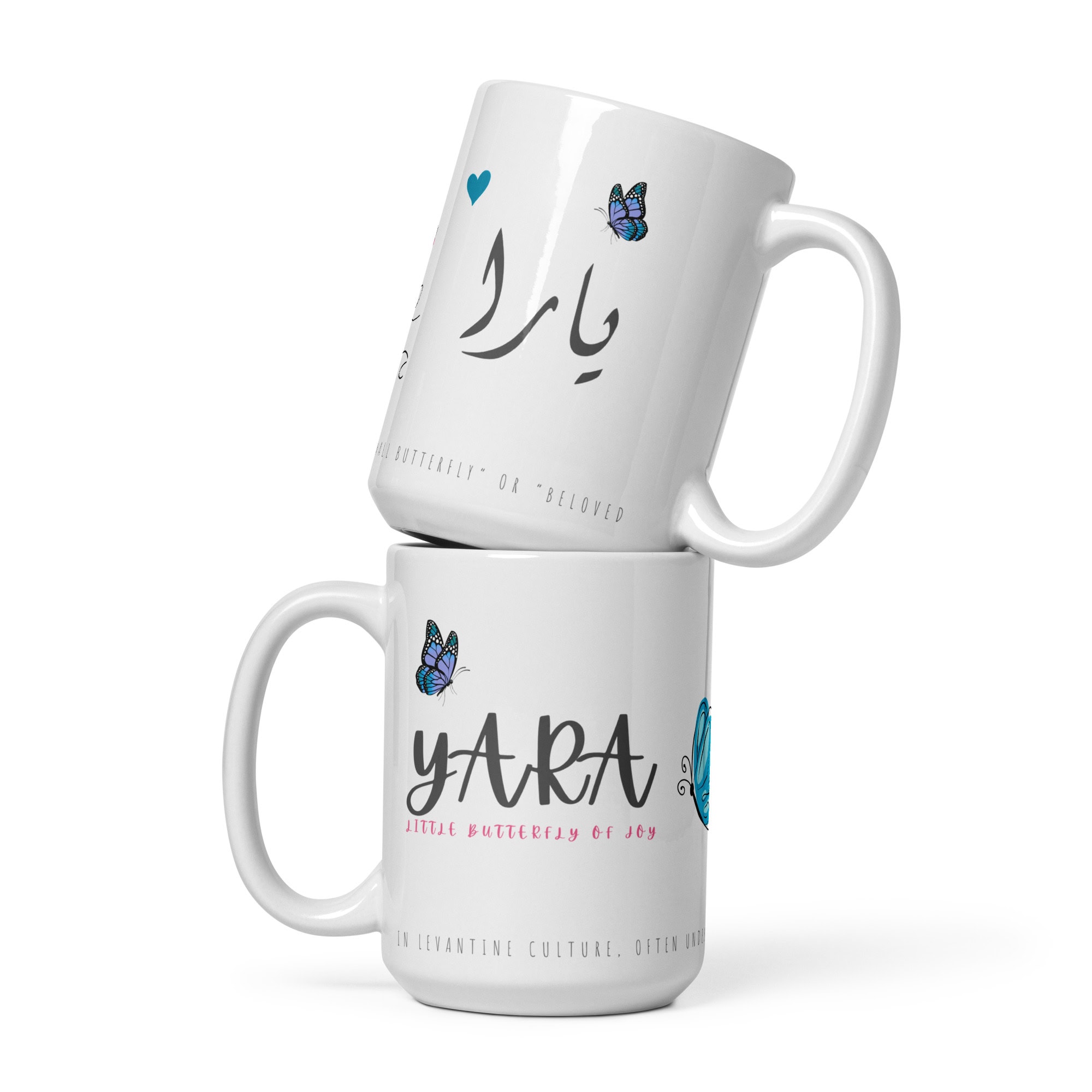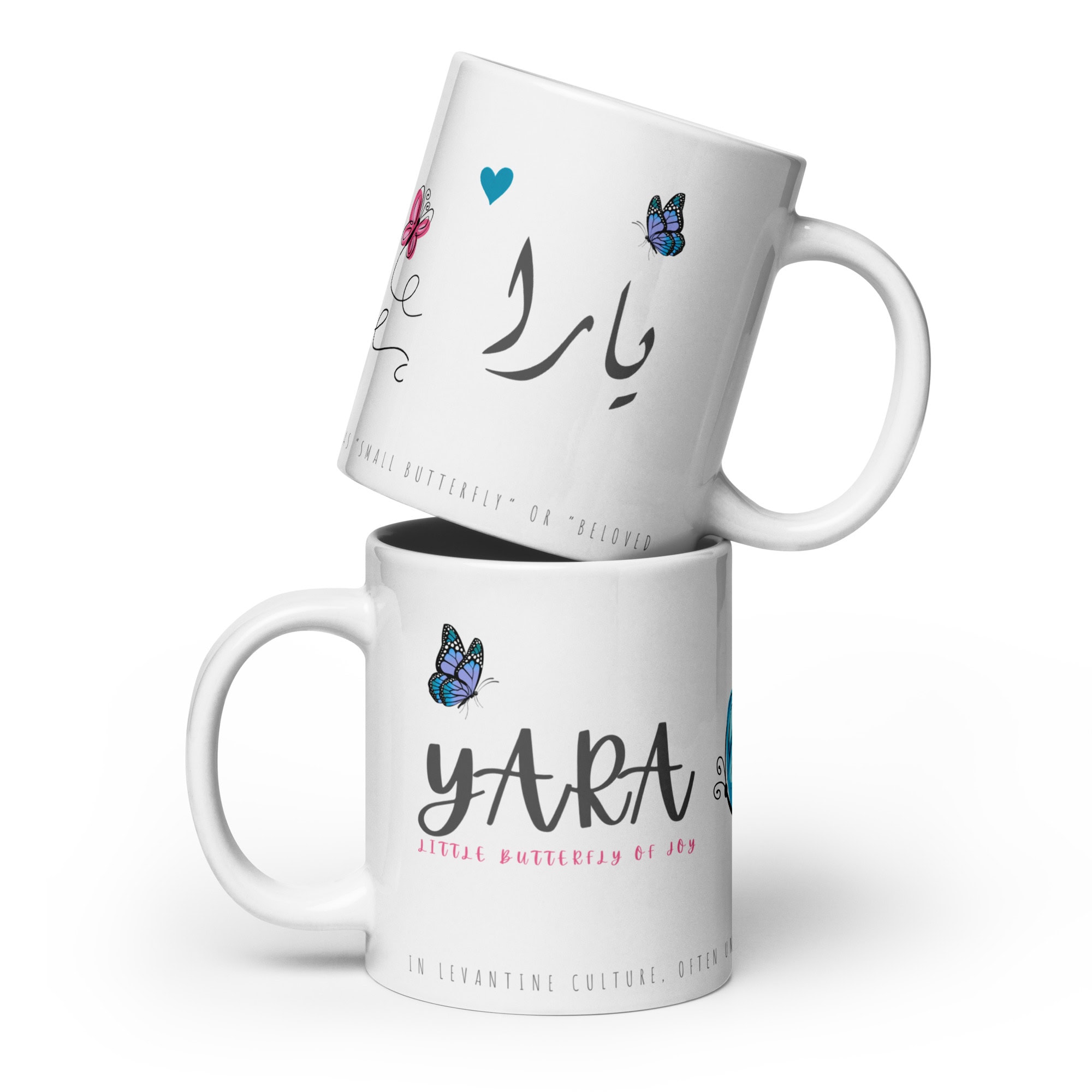 This cheerful and graceful mug blends elegant Arabic calligraphy with a soft English design, capturing the joyful essence of the name Yara â often associated in Levantine culture with a âlittle butterflyâ or a beloved one. The playful butterfly artwork adds motion, color, and happiness, while the poetic wrap-around meaning line completes the story with cultural warmth.