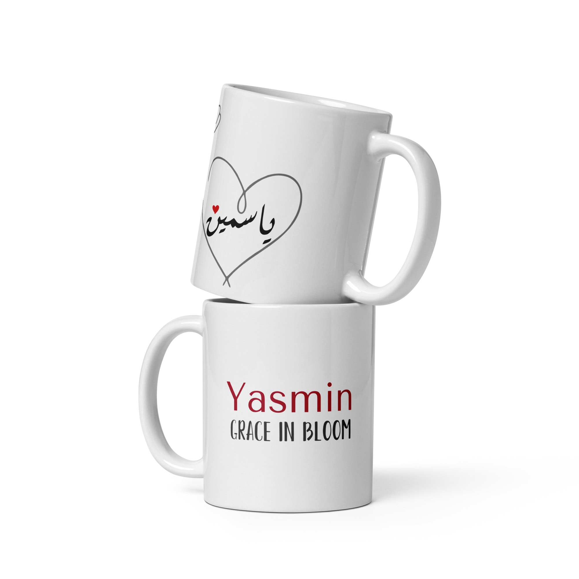 Elegant Arabic calligraphy mug featuring the name ياسمين (Yasmin) with a delicate floral heart motif.